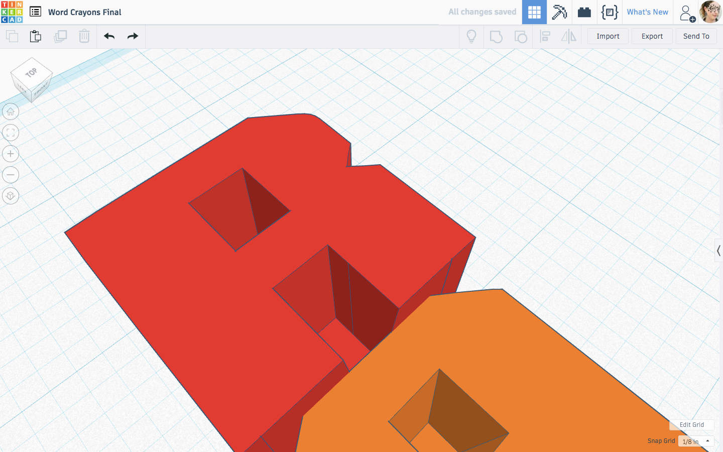 (After tests) I decided the "details" of the letters would only go down about 1/4" deep so they wouldn't go all the way through. As much as I wanted the holes in the letters to go all the way through, it just wasn't going to work out. I also decided the holes should go in at a slight angle to make it easier for the 3D print (and eventually the crayon) to come out of the mold. To make the holes have an angle, I created a cutout separately that went in on the bottom (instead of just going straight down) just using basic shapes (second image below). I filled in the hole in the letter so that there was no hole at all, and lined up my new hole cut out where the old holes used to be (third image below). My cutouts were a little messy but as long as they sliced right, I left them.