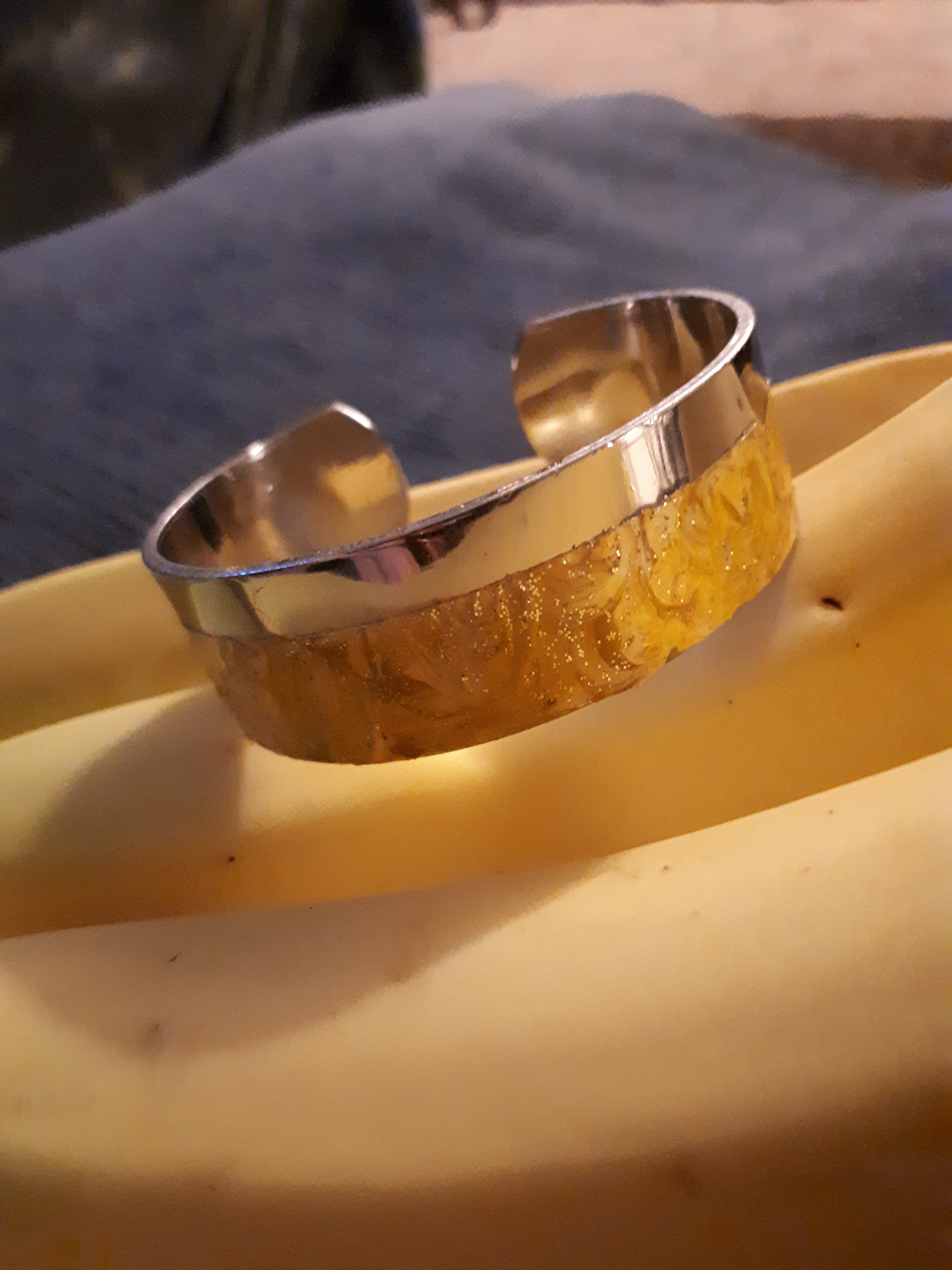 When the bracelet is cleaned, tape an area off to be left as negative space in your design. I chose to leave one thin line at the edge, but you can put it right through the center, or wherever you desire.